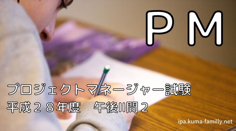 くまごろうです。この投稿ではプロジェクトマネージャ試験 平成28年午後Ⅱ問2「情報システム開発プロジェクトの実行中におけるリスクのコントロールについて」を解説します。